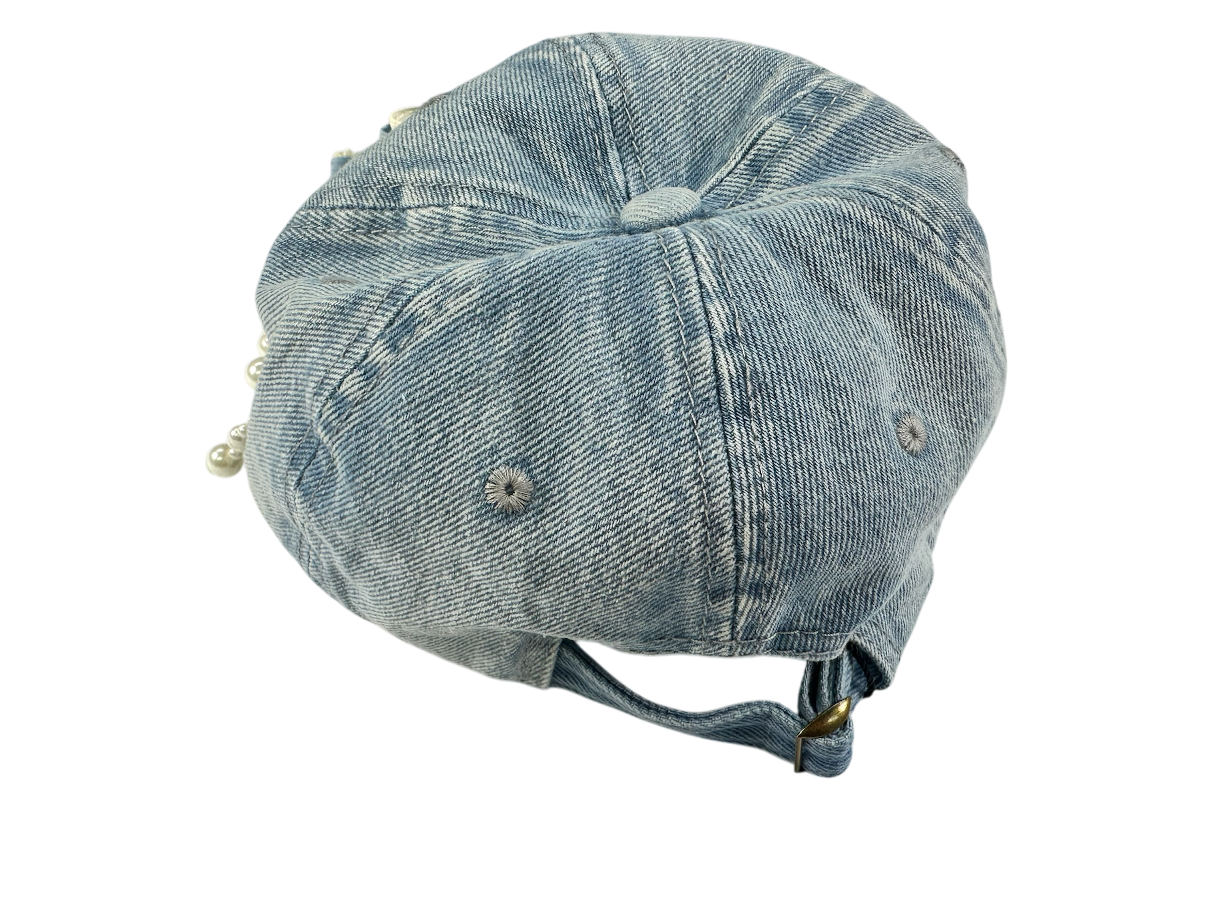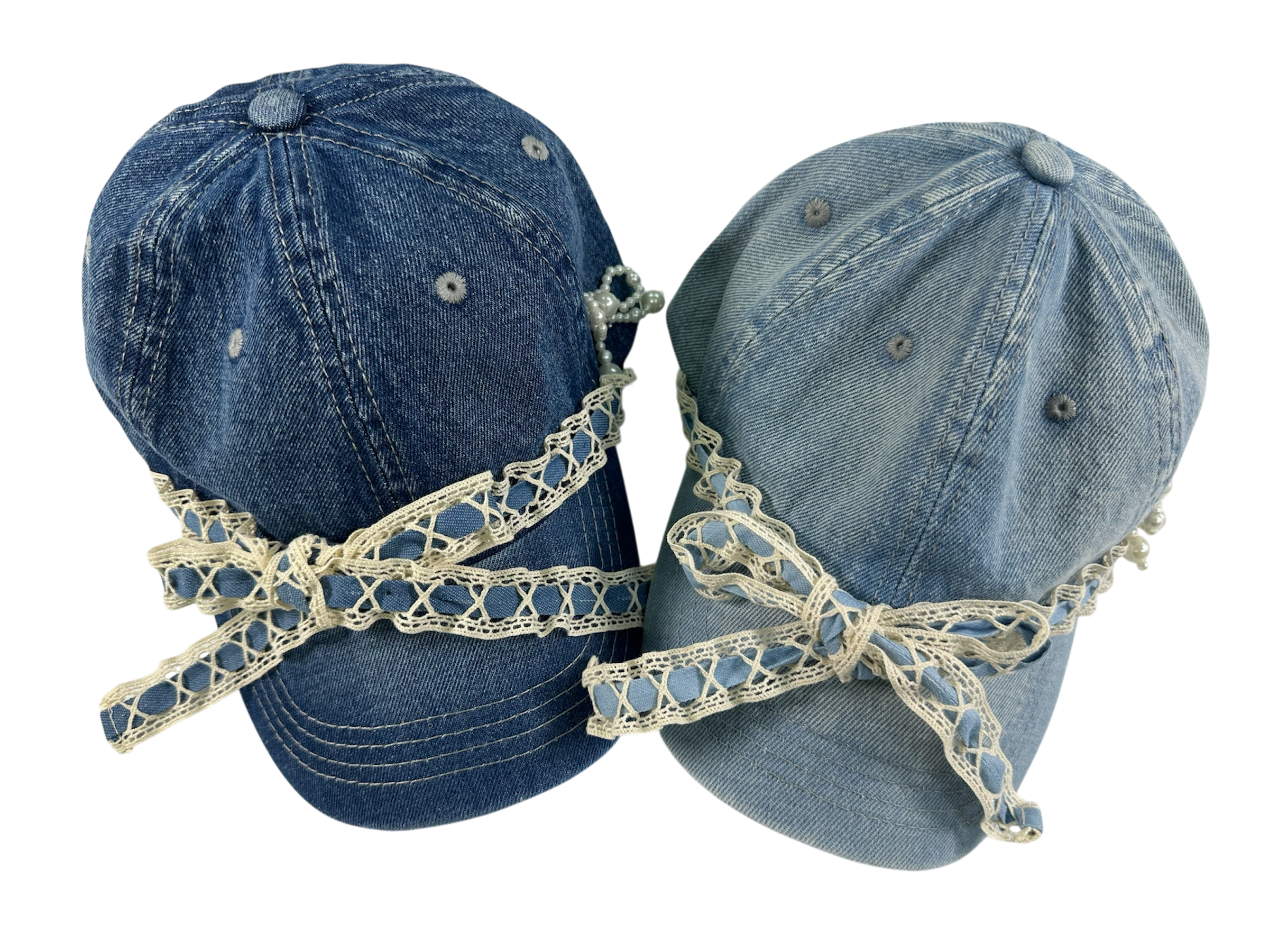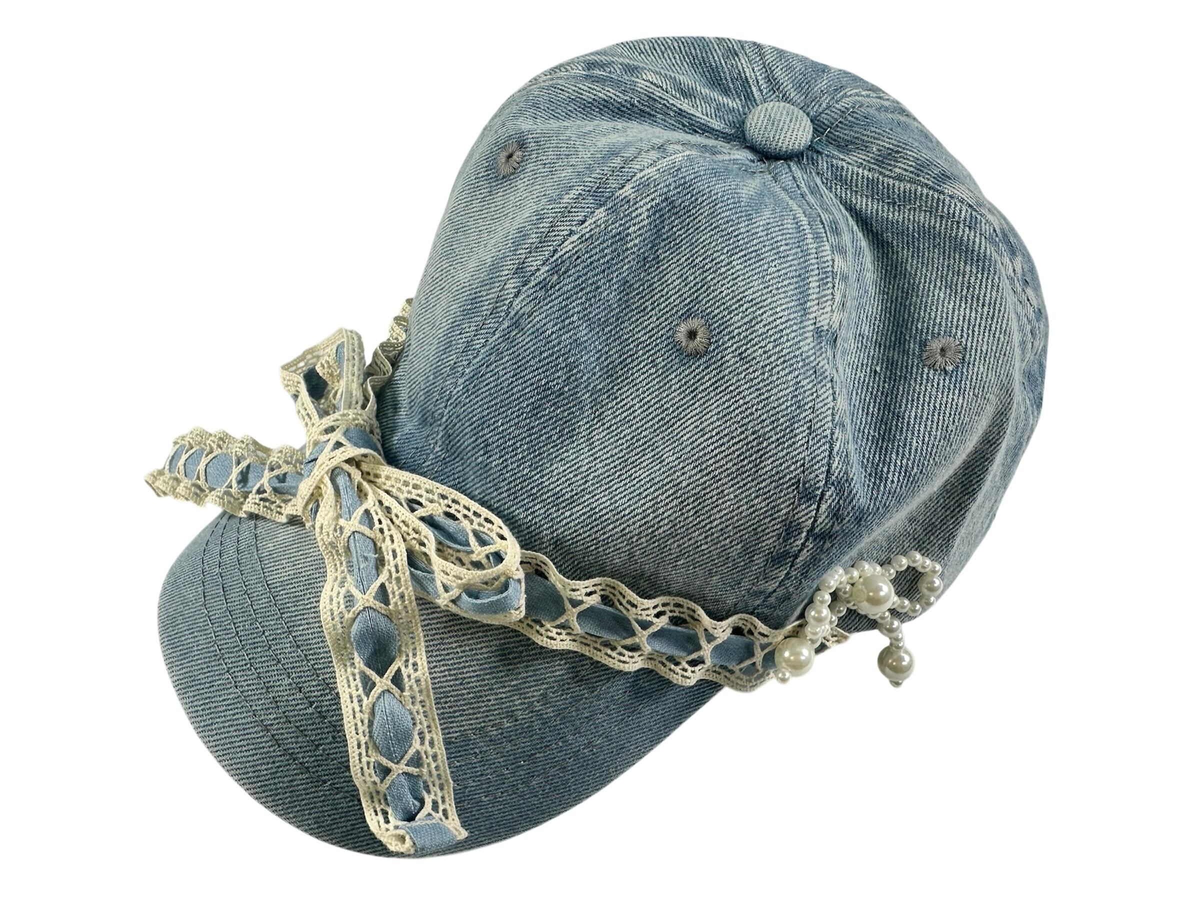 デニムキャップにレースリボンとパールをあしらい、おしゃれのポイントアイテムに是非お迎えください。